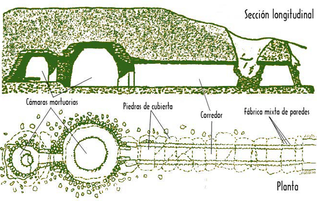 Un túmulo situado al noroeste, pasillo y salas.